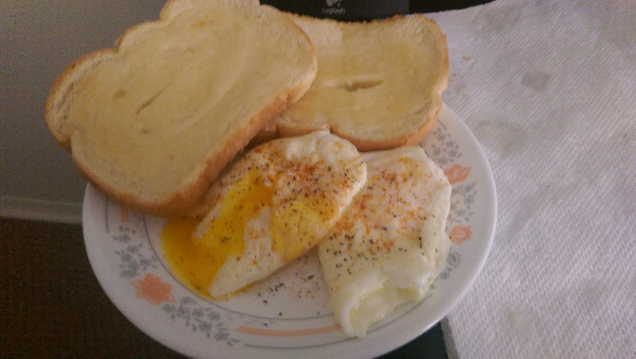 It’s still sort of morning at the point I’m typing this (it was even closer to still being morning when I made my breakfast, and since that’s what I’m focusing on it probably validates my previous statements a little). My typical approach to breakfast is either getting a bowl of cereal or “Oh, shit. I forgot to eat again”. Sometimes, when they are available, I’ll have waffles or something easy to make by the laziest of people, and I’m clearly not talking about the homemade kind so much as the stuff-in-the-toaster-and-hope-they-don’t-go-all-charcoal ones. Today, however, I decided to treat myself. I’ve always been quite fond of dippy eggs, but I only tried making them recently and figured I’d take another shot at it.