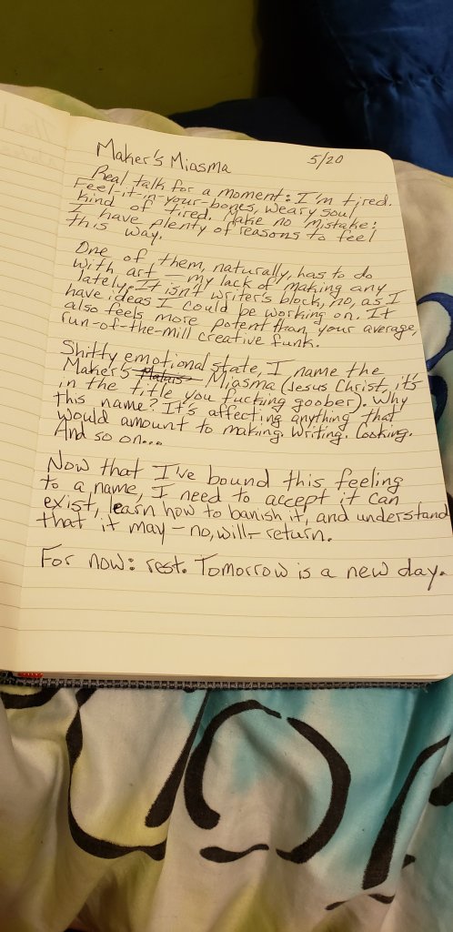 However, I am moved back to Carnegie as of a couple months ago (living partially out of boxes and bags is moved back in, right?). Life has gone on, and in ways I couldn’t have necessarily predicted but I’m entirely okay with (and no, I am not suggesting I won the lottery, so don’t start asking for yachts or anything). Tonight, when I have an overnight shift to work tomorrow and relatively unlimited time to stay up, I find myself frustrated. I am, as often is the case, in the throes of a creative funk. Continue reading
